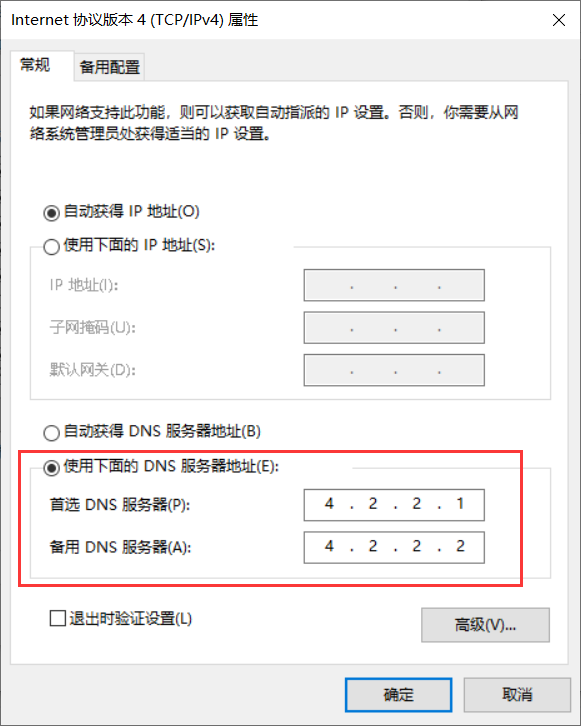 4、勾选“使用下面的DNS服务器地址”选项,DNS服务器设置为4.2.2.1和4.2.2.2,确定保存即可。